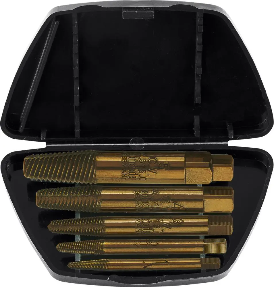 Sada šesti vytahováků Schröder Hi-Trac TP pokrývá rozsah M4 až M24, což umožňuje snadné odstranění zalomených šroubů různých velikostí v dílně i garáži. Robustní konstrukce zajišťuje dlouhou životnost a spolehlivost při opakovaném použití.