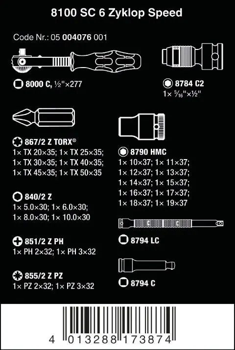 WERA 004076 Sada ráčnová Zyklop Speed 8100 SC 6, 28 d. upínací část 1/2"- metrická