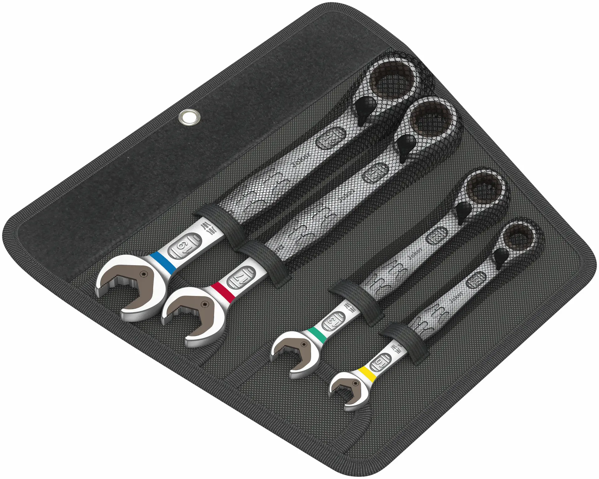 Sada čtyř očkoplochých ráčnových klíčů Wera Joker 6001 s rozsahem 10–19 mm nabízí vyhnuté provedení a ráčnový mechanismus pro rychlejší práci v těžko přístupných místech. Robustní konstrukce zajišťuje dlouhou životnost a spolehlivost při každodenním