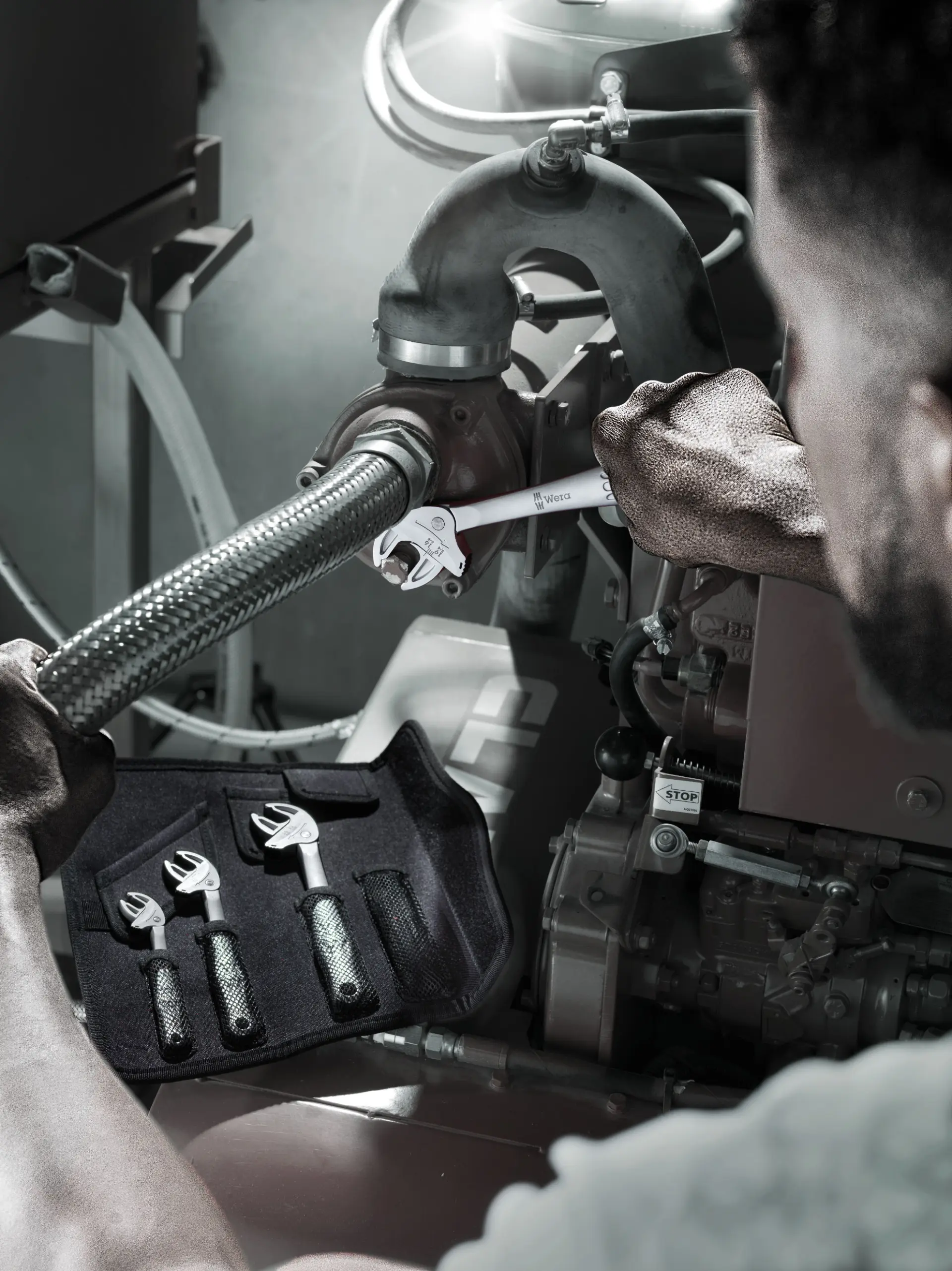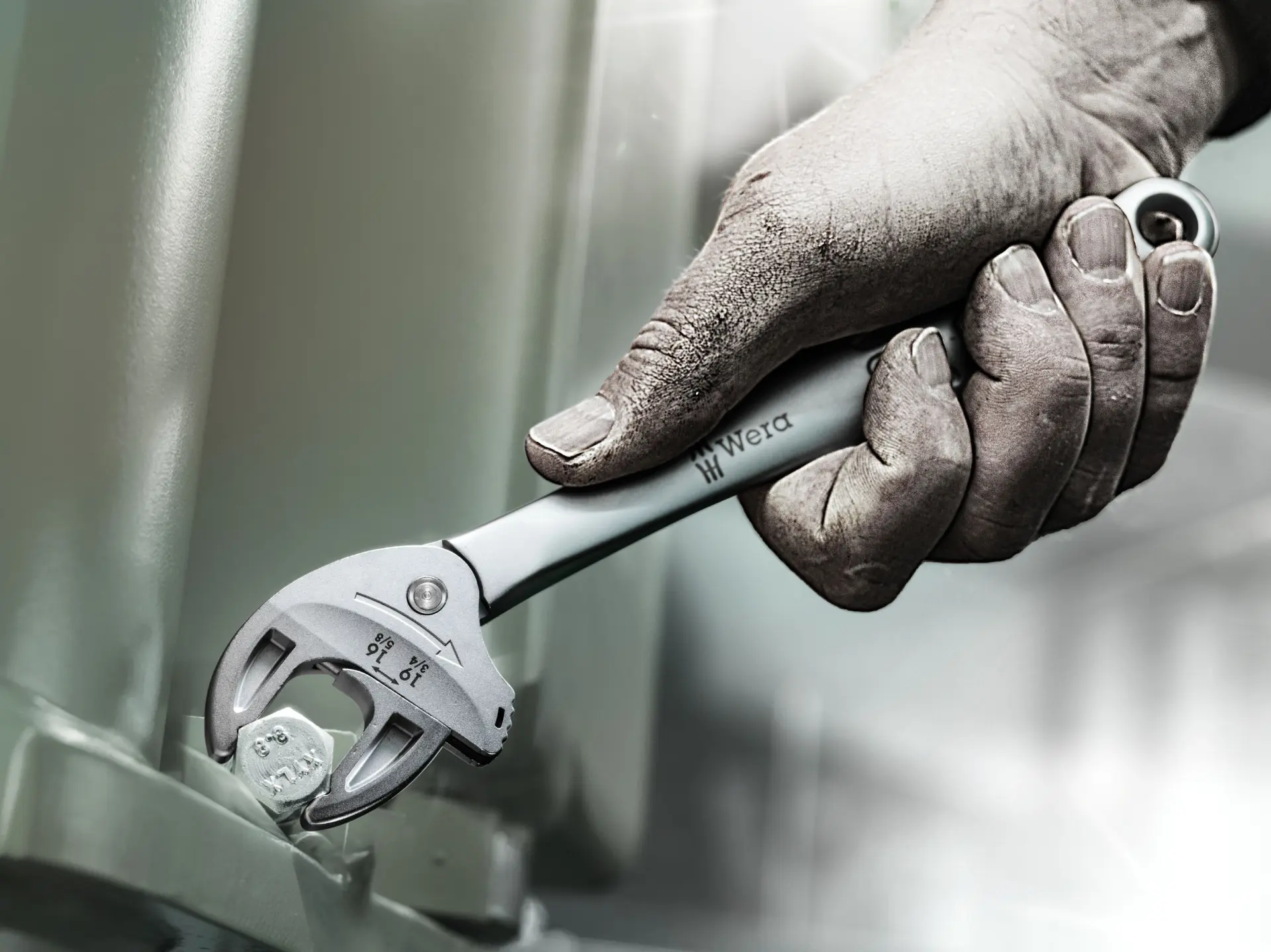 Automatické a plynulé uchopení šestihranných šroubů a matic jedením klíčem Joker 6006 pokrývajícím všechny metrické a palcové rozměry v příslušném rozsahu použití