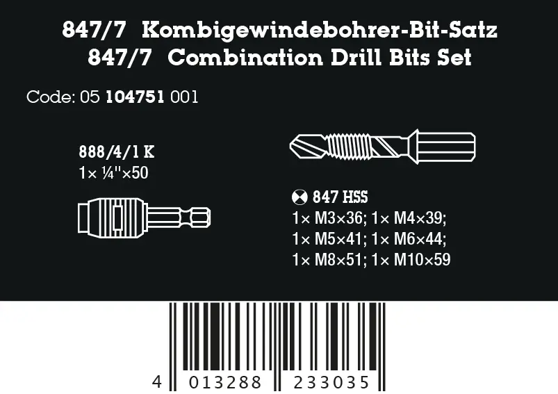 Wera 104751 Kombinované bity 1/4" s HSS závitníky M3 ÷ M10 typ 847/7 - 7 dílů (W05104751001)