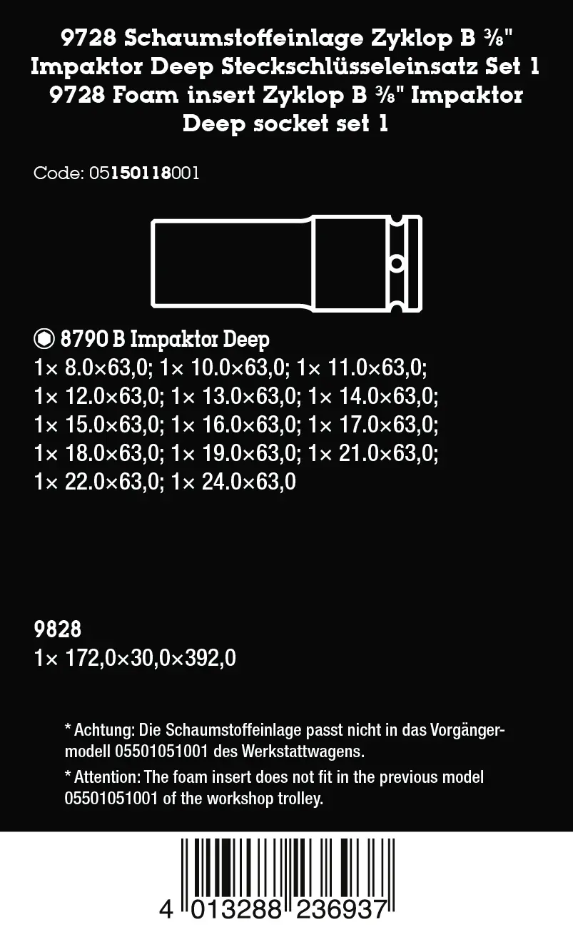 Wera 150118 Pěnová vložka 9728 s nástrčnými hlavicemi 3/8" 8790 B Impactor Deep Set 1 - 11 ks (W05150118001)