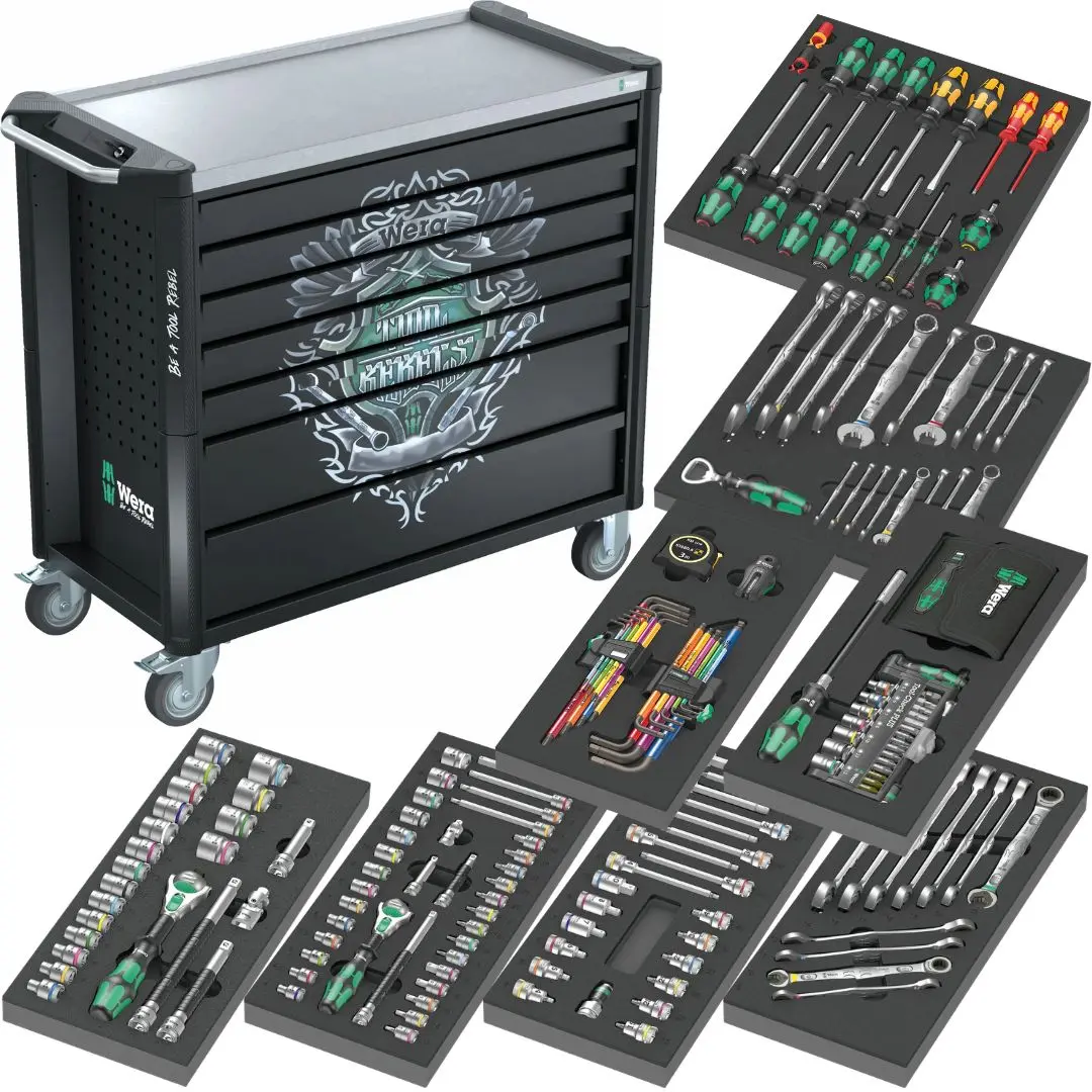 Se 7 zásuvkami (5 mělkých, 2 hluboké) - z toho 2 mělké zásuvky s pěnovými vložkami a nářadím (včetně ráčen Zyklop Speed a příslušenství 1/4" a 3/8", ráčnových klíčů s otevřeným/očkovým koncem a kombinovaných klíčů Joker, šroubováků Kraftform, imbusových klíčů, Kraftform Kompakt 60 a Tool-Check PLUS)