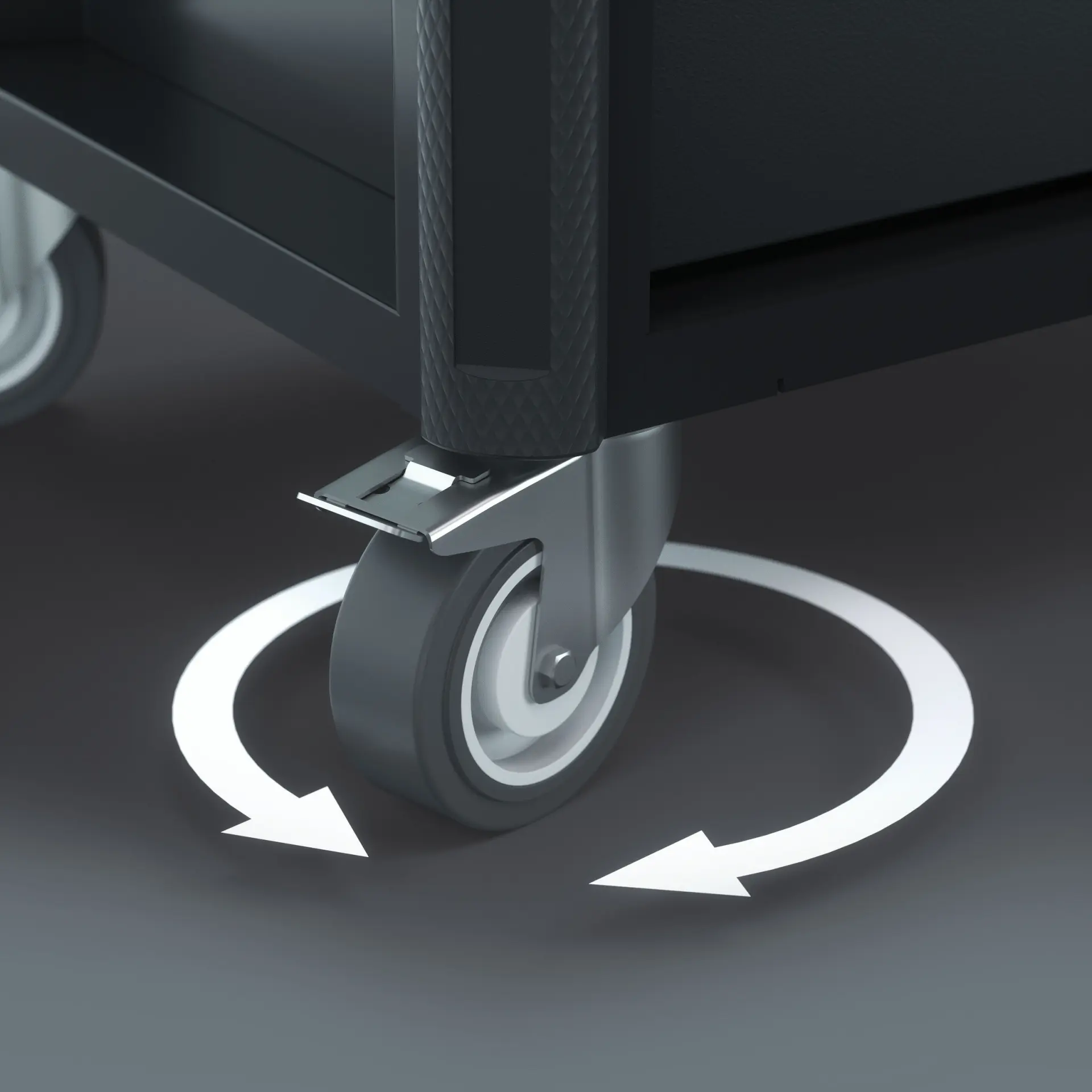 Dílenský vozík Tool Rebel se vyznačuje velkými, odolnými koly s přesnými kuličkovými ložisky a dvojitým kuličkovým věncem v otočném ložisku
