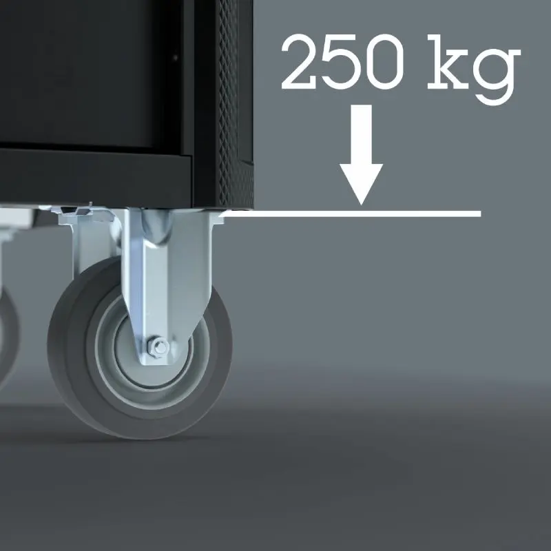 Dílenský vozík Tool Rebel se vyznačuje velkými, odolnými koly s přesnými kuličkovými ložisky a dvojitým kuličkovým věncem v otočném ložisku