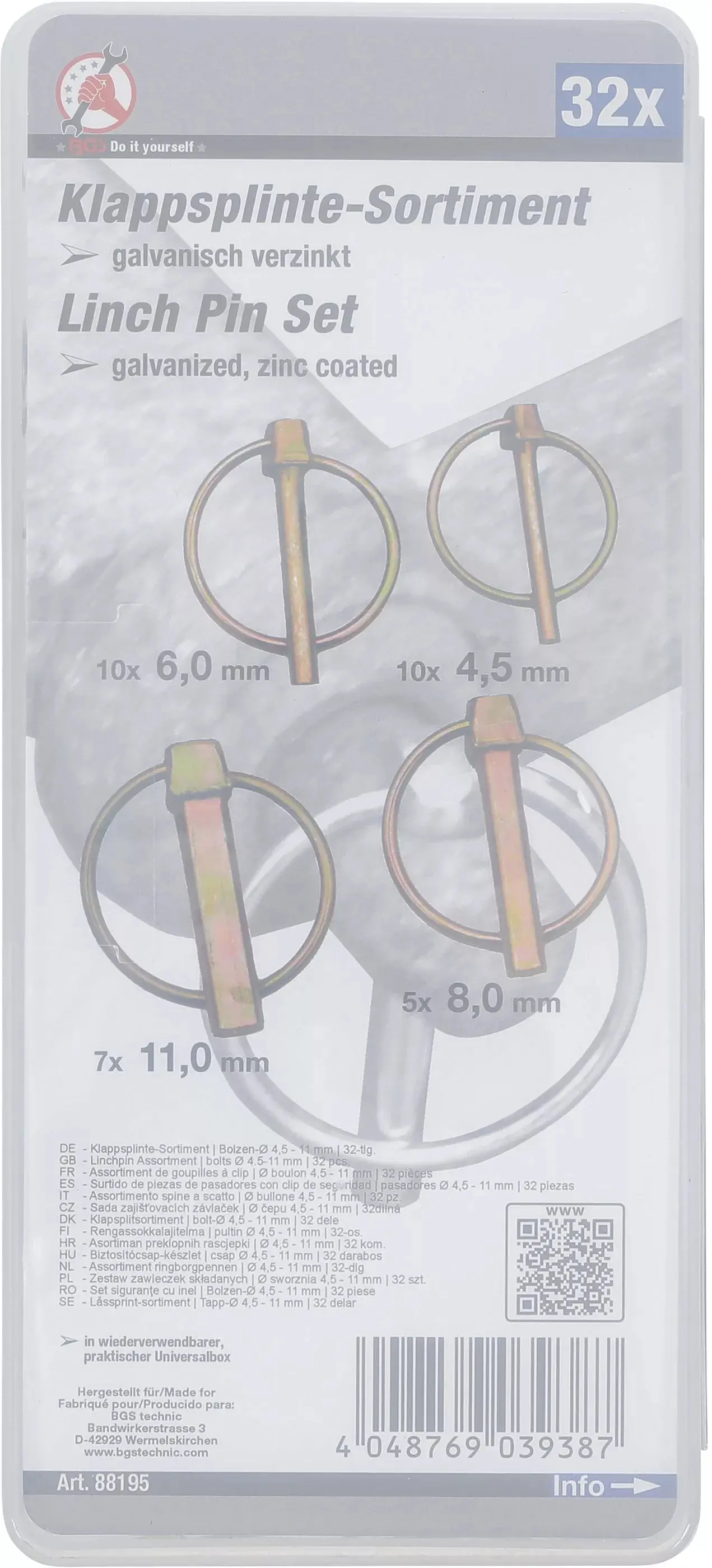 Sada 32 zajišťovacích závlaček Kraftmann je určena pro čepy o průměru 4,5 až 11 mm a usnadňuje pevné spojení součástí v různých mechanických aplikacích. Vhodné pro dílnu i domácí použití, balení obsahuje různé velikosti pro univerzální využití.