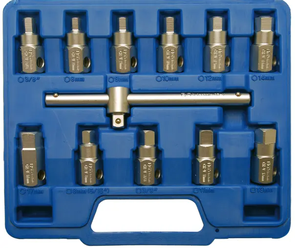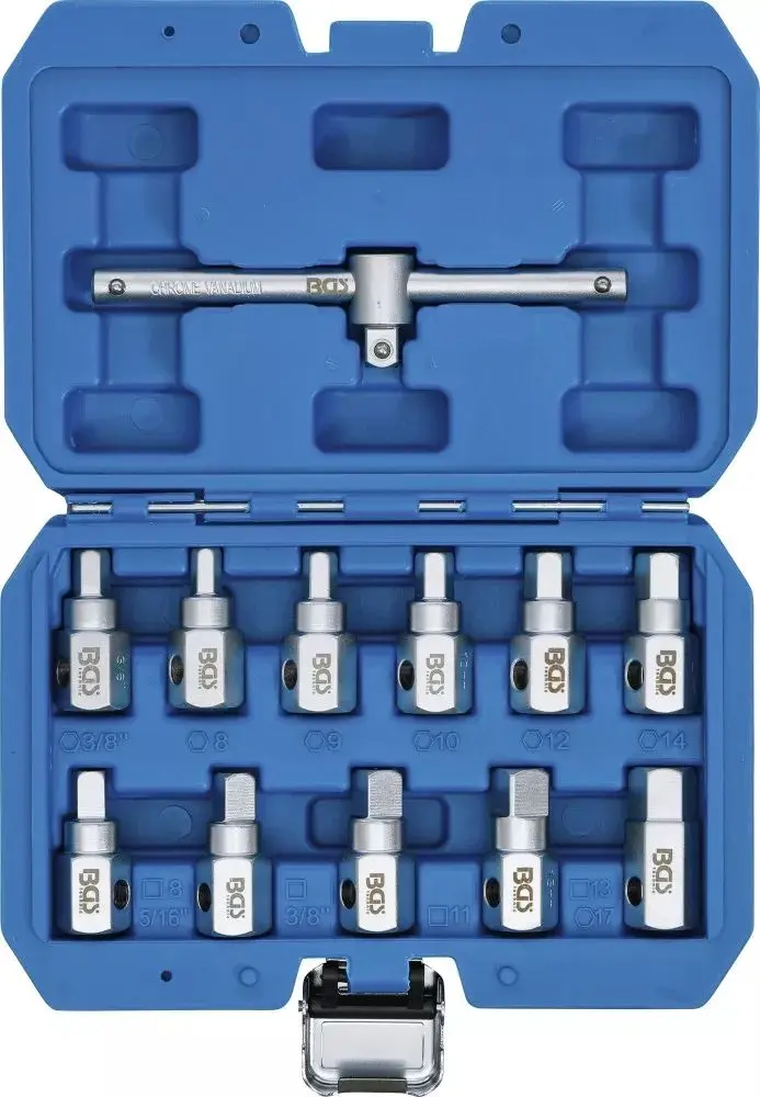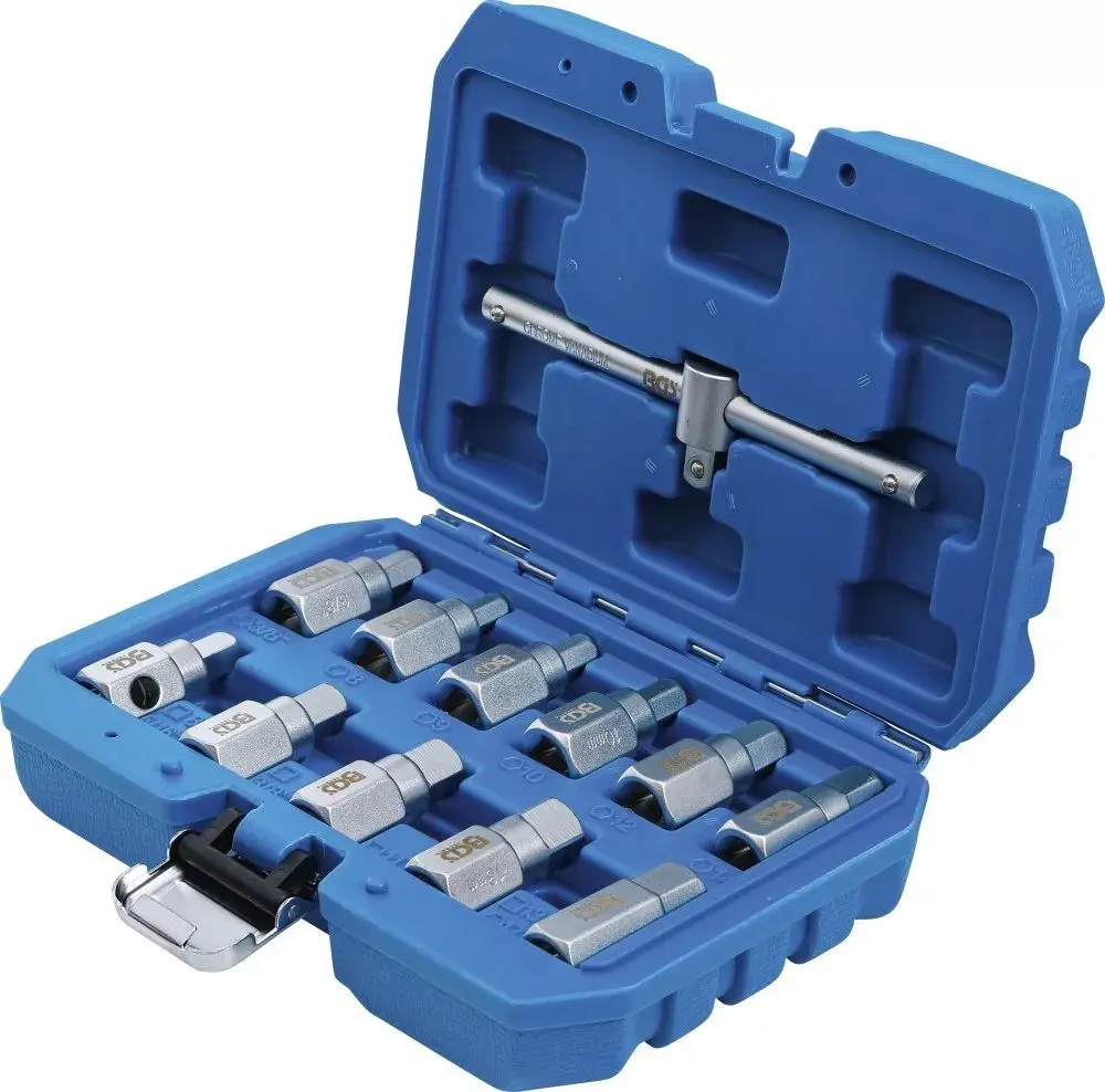 Sada zástrčných hlavic 3/8" BGS101017 obsahuje 12 dílů určených pro demontáž a montáž olejových van různých automobilů. Robustní provedení zajišťuje dlouhou životnost a spolehlivost při práci v dílně.