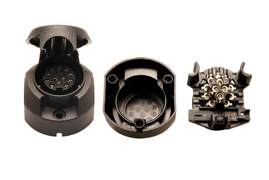 13kolíková zásuvka pro přívěs je určena k propojení elektrické instalace tažného vozidla s přívěsem. Tento typ zásuvky umožňuje přenos signálů pro světla, brzdová světla, směrovky i napájení dalších zařízení na přívěsu, což zajišťuje plnou funkčnost všech potřebných elektrických okruhů během jízdy.
