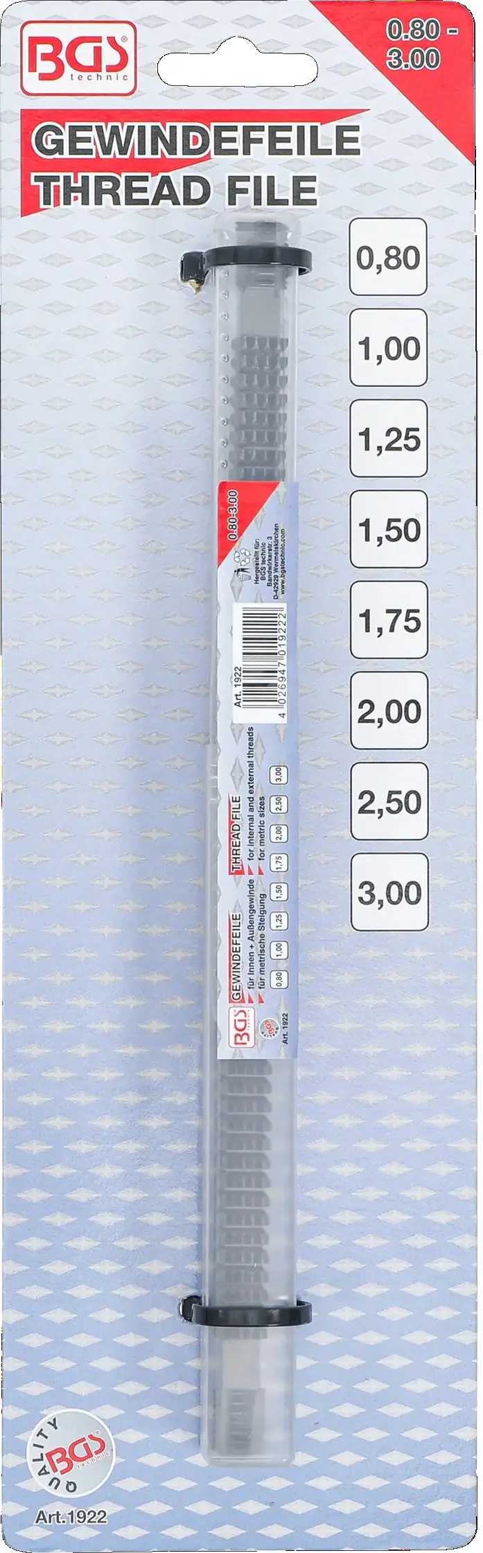Závitový pilník BGS101922 je určen pro opravy vnitřních i vnějších metrických závitů v rozsahu 0,80 až 3,00 mm podle normy ISO. Praktický nástroj pro přesné úpravy závitů v dílně i domácnosti.